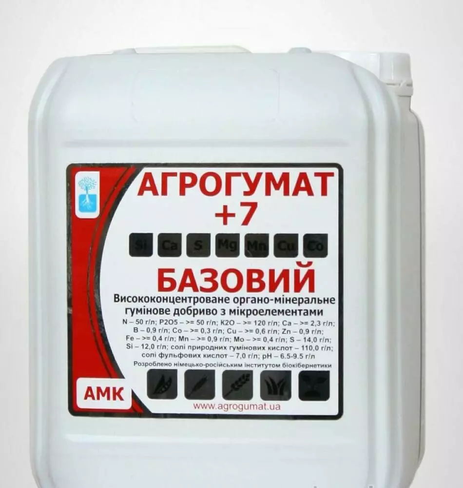Состав: Гуминовые вещества = 150 г л, Фульвокислоты = 2 г л, калий = 30 г л, фосфор = 20 г л, Fe Mg Mn B Cu Zn = по 3 г л Норма 0,5 - 4 л.